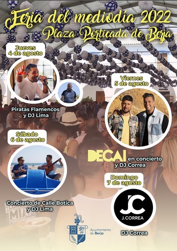 El área de Fiestas del Ayuntamiento de Berja ha preparado una gran programación para la Feria del mediodía 2022 que, tras la pandemia de la Covid-19, vuelve a la Plaza Porticada como punto de encuentro de virgitanos y visitantes que este año podrán disfrutar de actuaciones de primer nivel entre las que destaca el concierto del grupo Decai.