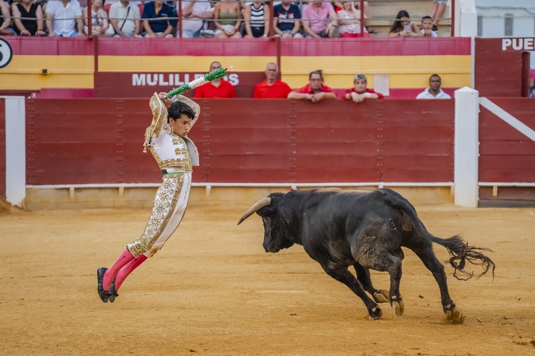 Israel Guirao, de la Escuela Taurina de Valencia, fue de menos a más haciendo al toro en cada pase. Con una imagen muy torera, afrontó la ultima parte de la corrida descalzo. La suerte no le acompañó con la espada lo que le privó de los triunfos.