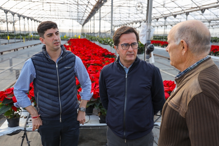 El primer edil ha recorrido las instalaciones junto a su presidente, Francisco Luque, para conocer de primera mano cómo está funcionando esta campaña la comercialización de Poinsetia o Flor de Pascua, puesto que consiste en una de las campañas más importantes del año para las empresas de este sector.