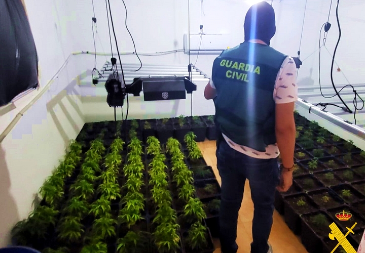 La Guardia Civil llevó a cabo el registro de la vivienda, en cuyo interior se encontraba un cultivo de marihuana, distribuido en tres de sus habitaciones, con un total de 390 plantas en distintas fases de crecimiento. Este hallazgo pone de manifiesto que el inmueble estaba dedicado exclusivamente a la producción continua de las mismas. Cada estancia albergaba equipos destinados al cultivo de la droga, como balastros con portalámparas y bombillas, filtros antiolor, recipientes con fertilizantes, sistemas de aire acondicionado, extractores, programadores eléctricos y otros dispositivos relacionados. Además, la plantación contaba con una instalación de iluminación mediante focos LED, diseñada para minimizar el consumo eléctrico y así evitar ser detectada por anomalías en el suministro energético y, de esta forma, pasar desapercibida.