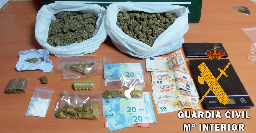 En esta actuación, dentro de la denominada operación “Pomari”, la Guardia Civil se ha incautado de 485 gr. de marihuana, 66,3 gr. de hachís, 4,8 gr. De polen de hachís, 6,7 gr. de cocaína, así como material para preparar las dosis.