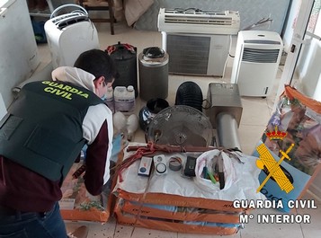 Tras inspeccionar y proceder al correspondiente registro, se intervienen 4 aparatos de aa/cc completos, 8 equipos de iluminación de 600w, 2 extractores con filtros antipolen, 3 garrafas de abono, 400 litros de turba y multitud de herramientas utilizadas habitualmente en los cultivos indoor de marihuana, además también se hallan útiles para el pesaje, envoltorio y venta de las dosis de droga, de igual manera también se localizan enganches ilegales a la red de suministro eléctrico e hídrico.
