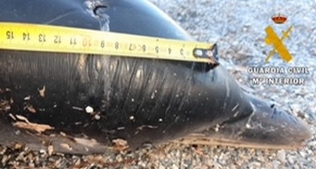 El delfín listado goza de una protección especial, los técnicos de Equinac observan como el cuerpo del delfín no tiene la aleta dorsal, que aparece seccionada, apreciándose un corte producido por la acción del hombre.