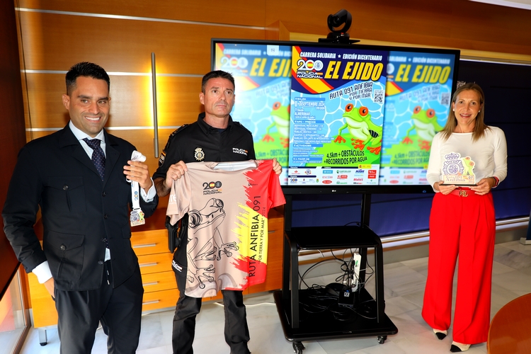 María José Martín, concejal de Deportes; César Mantero Gómez, inspector de Policía y secretario de la Comisaría Local de Policía Nacional de El Ejido; y Eduardo Fernández Martín, director de sucursal Banco de Santander, han dado a conocer hoy en la Sala de Junta de Gobierno Local del Ayuntamiento los detalles de esta cita que coincide con la celebración del bicentenario de la Policía Nacional, que con esta carrera demuestra su compromiso y ayuda a los demás, así como con la sociedad ejidense.