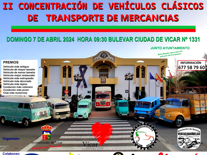 Los vehículos clásicos volverán a invadir el municipio de Vícar este domingo día 7 de abril de la mano de la II Concentración de Vehículos Clásicos de Transporte de Mercancías. La jornada de convivencia tendrá lugar en la explanada junto al Ayuntamiento de Vícar y está organizada por el consistorio junto a la Asociación de Vecinos Ventacabañuelas y el Club Cacharricas.