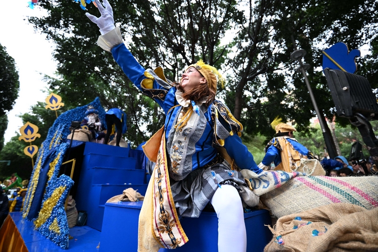SS.MM los Reyes Magos de Oriente, que se parecían a mucho al empresario hotelero Lázaro López, al diseñador Sergi Regal, y al técnico deportivo Said Zamani, repartían los miles de caramelos en sus carrozas reales, en un séquito, donde había otras ocho carrozas con motivos infantiles, dedicadas a la Estrella de Oriente plateada, regalos para todos, filigranas navideñas, Mary Poppins, el trineo Frozen, Los Vengadores, la Guerra de las Galaxias y la casita de chocolate. Por último, las carrozas con las cartas de los niños y niñas, la fábrica de caramelos y, para los que han sido traviesos, la de Carbón. Un total de catorce carrozas. Además, todo el recorrido ha estado animado por diferentes bandas de la tierra.