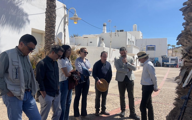 El delegado territorial de Turismo, Cultura y Deporte en Almería, Juan José Alonso, la diputada de Turismo, María José Herrada; la concejala de Cultura de Níjar, María Jesús López; el presidente de la Asociación de Empresas de Servicios Turísticos del Parque Natural Cabo de Gata-Níjar (ASEMPARNA), Francisco García; y el director del taller, el pintor realista almeriense Andrés García Ibáñez, han visitado en La Isleta del Moro (Parque Natural Cabo de Gata-Níjar) el Taller de Pintura de Paisaje Natural, que celebra su IV edición del 15 al 19 de abril.