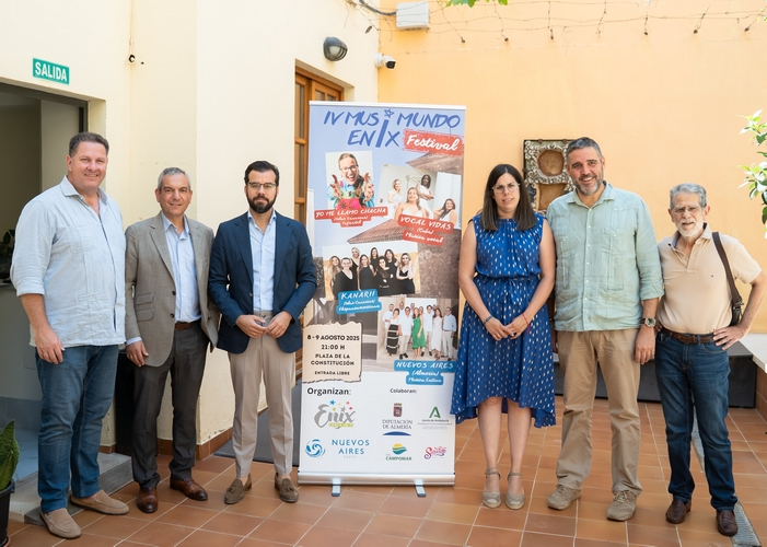 Este evento se lleva a cabo gracias a la colaboración institucional entre el Ayuntamiento de Enix, la Diputación de Almería y la Junta de Andalucía, junto al grupo Nuevos Aires y diferentes patrocinadores privados como la EFA Campomar y la Escuela de Baile Salsatore. Esta mañana la diputada de Cultura, Cine e Identidad Almeriense, Almudena Morales; el alcalde de Enix y diputado provincial, Álvaro Izquierdo; el delegado de Cultura de la Junta, Juan José Alonso; José María Molina, director de EFA Campomar y el representante de la Asociación Cultural Grupo Musical Nuevos Aires, José María Díaz, han dado a conocer las claves del IV Musimundo Enix.