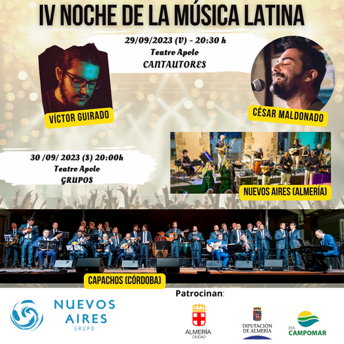 Por cuarto año consecutivo el otoño cultural de la capital almeriense adquiere sabor latino con la celebración del festival “La Noche de la Música Latina”, organizado por la Asociación Cultural Grupo Nuevos Aires, con la colaboración directa tanto del Área de Cultura, Tradiciones y Fiestas Mayores del Ayuntamiento de Almería como del Área de Cultura de Diputación Provincial, además de contar este año con el patrocinio de EFA Campomar. La cita con este género musical se consolida como una propuesta habitual e imprescindible del otoño almeriense y volverá a llenar de esta música las tablas del Teatro Apolo durante dos veladas, los días 29 y 30 de septiembre.