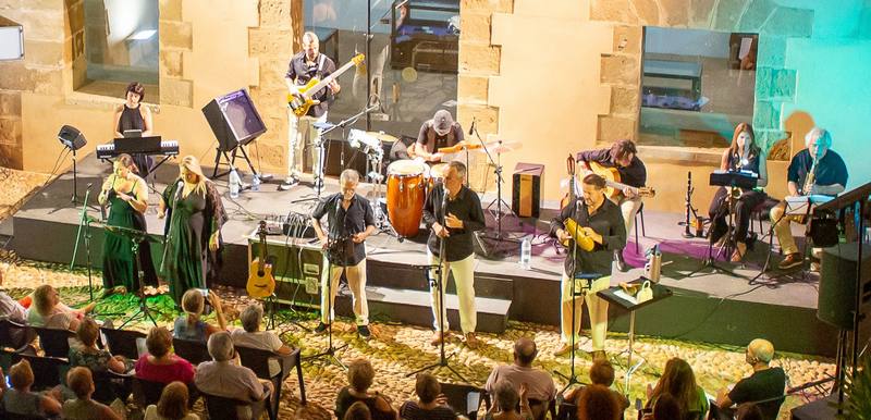 Grupo Capachos. Montilla (Córdoba). Es un proyecto que surge de la convergencia de más de una treintena de músicos en torno a una idea que ha dado como resultado un estilo y un sonido propios, características que identifican a esta formación cordobesa nacida en 2010 y que, mediante la combinación precisa de innovación y tradición, consigue descubrir en cada nota musical la clave con la que hacer aflorar los sentimientos y las sensaciones que las canciones encierran. Capachos ponen en escena, con su peculiar y original estilo, versiones de conocidas composiciones de géneros tan variados como el bolero, el tango, la copla, el fado, la chacarera, la samba, la balada, el son cubano o la ranchera mexicana, hilvanadas por un argumento teatral, representado por actores, que les va dando sentido en el contexto de una historia cargada de sensibilidad y sentimientos. En primavera lanzaron su tercer disco, “Mi Buen Amor”, grabado en directo en el Teatro Garnelo de Montilla en julio de 2022. Esta producción, que ahora presentan en Almería, hace un recorrido por el género “canción de autor” desde la perspectiva y la sonoridad coral-instrumental de Capachos, con temas de Serrat, Sabina, El Kanka, Ismael Serrano o Luis Eduardo Aute, entre otros.