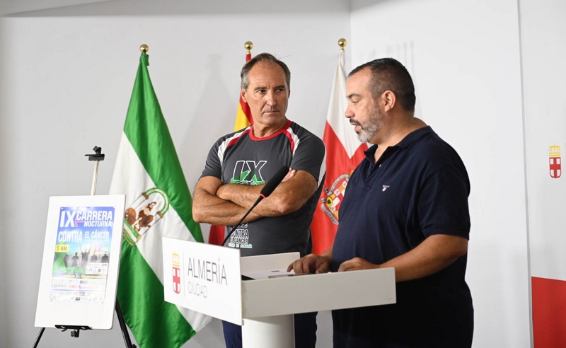 Correr por el Centro Histórico y hacerlo por un fin social son los dos grandes atractivos de la IX Carrera Nocturna Contra el Cáncer Ciudad de Almería, que tendrá lugar el próximo sábado, 12 de julio, a partir de las 21.30 horas. La prueba ha sido presentada hoy por el concejal de Ciudad Activa, Movilidad Urbana y Deporte, Antonio Casimiro, y el presidente de la Asociación Cultural y Deportiva Contra el Cáncer Ciudad de Almería, Jesús Díaz.