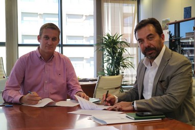 El delegado de Medio Ambiente y Ordenación del Territorio, Raúl Enríquez y el representante de la empresa Ingeniería ATECSUR S.L. , José Antonio Delgado, han formalizado este viernes los contratos de redacción de dos nuevos proyectos de saneamiento y depuración que se van a llevar a cabo en los municipios almerienses de Alhama y Mojácar.