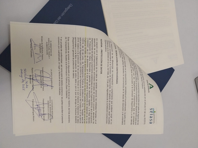 Según ha explicado el consejero de Agricultura, Pesca, Agua y Desarrollo Rural, Ramón Fernández-Pacheco, “a pesar de que hace un mes desde que el Gobierno central escenificó en Sevilla la firma de dicho documento, el convenio no se ha recibido hasta este mismo martes en la sede de la consejería y ha sido en ese preciso momento en el que se ha firmado, por lo que la vigencia del mismo comienza a partir de este martes”.
