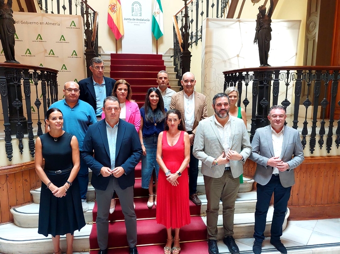 La delegada del Gobierno de la Junta de Andalucía, Aránzazu Martín, acompañada por el delegado de territorial de Turismo, Cultura y Deporte Juan José Alonso, ha recibido a los representantes institucionales de los Ayuntamientos que han sido beneficiarios de las ayudas que la administración autonómica ha concedido a 7 municipios de la provincia para la mejora, reforma o reparación de sus infraestructuras deportivas. Estos municipios son Huércal de Almería, Tíjola, Huércal Overa, Berja, Níjar, Albox y Benahadux.