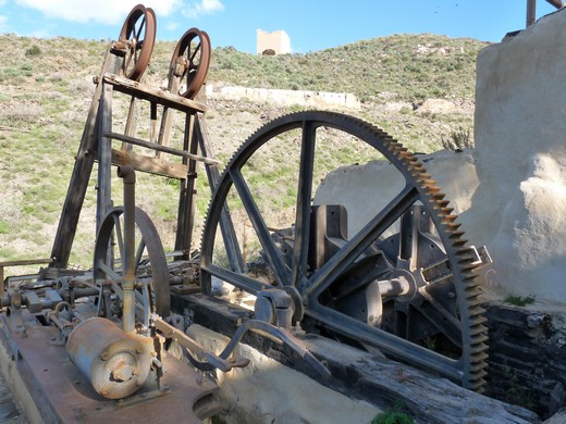 Fabricada por la británica Reading Iron Works en 1873, había sido diseñada por el ingeniero mecánico belga Paul Colson, quien, como hiciese con tantas otras máquinas en Almagrera y Herrerías, también se ocupó de su montaje. Este BIC (2003) ilustra aquella etapa de transición desde los sistemas de extracción tradicionales, a sangre (tornos manuales y malacates movidos por caballerías), a los impulsados por vapor, una particular revolución industrial que aconteció en Almagrera a fines del XIX. Tras su restauración y puesta en valor hace más de una década, desde el Ayuntamiento de Cuevas del Almanzora se promovió durante el pasado 2019 una intervención urgente sobre la cabria con el fin de corregir una excesiva inclinación que amenazaba con su derrumbe, una mejora que debería completarse con precisos trabajos de conservación sobre la propia máquina y los demás elementos del entorno.