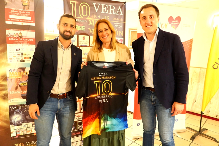 . El Ayuntamiento de Vera, y el Club Atletismo Sur Este han presentado en Hotel Restaurante Terraza Carmona, la décima edición de la Media Maratón de Vera 2024, en un acto donde han intervenido el alcalde de la localidad, Alfonso García, el concejal de Deportes, Antonio Soler, y la diputada provincial Esther Álvarez, junto con la actual presidenta del Club, Reme Martínez Serrano, además de los presidentes del Club Atletismo Sur Este que durante estos diez años de la prueba han presidido el club local, alma en la organización del evento junto al Ayuntamiento de Vera. Durante el evento, magistralmente presentado por la componente del Club, María José Ruiz, se presentó la camiseta oficial de la prueba y se anunció que toda la recaudación de las carreras infantiles se donará a la fundación UNO ENTRE CIEN MIL que lucha cada día por ganar la batalla a la leucemia Infantil y se contará como invitado a la carrera con Francisco Martin Pérez, conocido como tractorman, impulsor de esta colaboración.