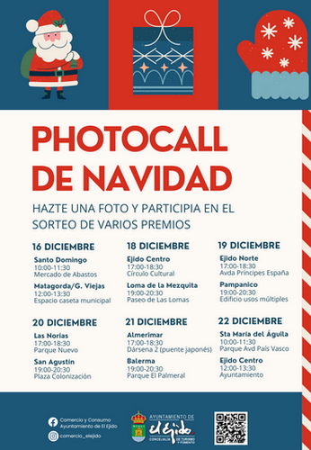 Una completa programación que también llega a los núcleos de población con numerosas acciones gratuitas culturales, de convivencia, infantiles y lúdicas que han previsto las Juntas Locales junto a asociaciones, colectivos y vecinos. Entre estas actividades, cabe destacar las colchonetas infantiles y el photocall de Navidad de la concejalía de Turismo y Comercio. Este último, además de disfrutarse en cada núcleo, también llegará a barrios como Santo Domingo (sábado 16 de diciembre), la Loma de la Mezquita, Ejido centro y Ejido norte.