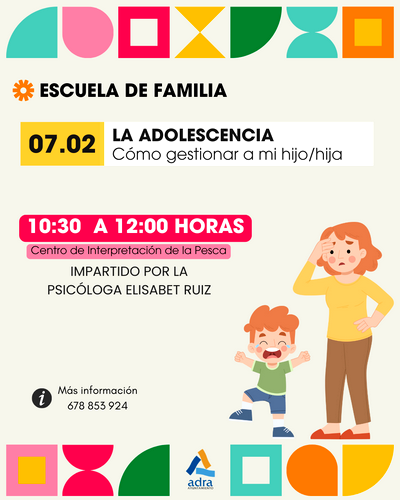La programación de la nueva edición de la Escuela de Familia de Adra comienza con la el próximo viernes, 7 de febrero, con el coloquio ‘La adolescencia: Cómo gestionar a mi hijo/a’. Una charla impartida por la psicóloga del Ayuntamiento de Adra, Elisabet Ruiz, que se celebrará en el Centro de Interpretación de la Pesca, de 10:30 a 12:00 horas.