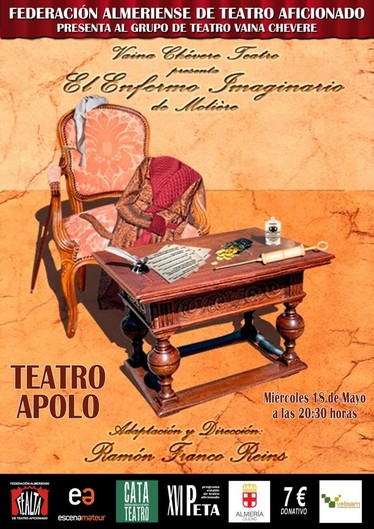 La Federación Almeriense de Teatro Aficionado (FEALTA), con la colaboración del Área de Cultura y Educación del Ayuntamiento de Almería, volverá a alzar el telón del Apolo mañana, miércoles, 18 de mayo, a las 20.30 horas, con una nueva obra dentro de su ciclo de actuaciones que desarrolla durante la práctica totalidad del año. Se trata, en este caso, del grupo Vaina Chévere, que llevará a escena la obra ‘El enfermo imaginario’, con texto de Molière, adaptada y dirigida por Ramón Franco Reins.