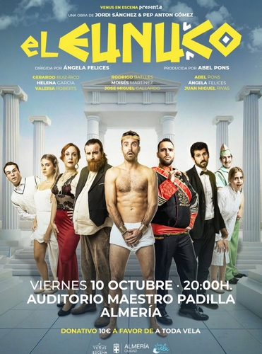 Tras colgar el cartel de ‘entradas agotadas’ en el Teatro Apolo hace unas semanas con ‘Dos + Dos’, la compañía almeriense Venus en Escena vuelve a conquistar la capital con su éxito teatral ‘El Eunuco’, una desbordante comedia musical que se representará en el Auditorio Municipal Maestro Padilla este próximo viernes, 10 de octubre, a las 20.00 horas, en una función muy especial a beneficio de la asociación A Toda Vela.