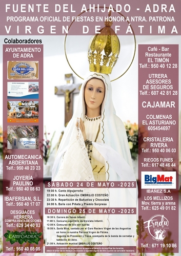 La pedanía Fuente del Ahijado de Adra celebra este fin de semana sus fiestas patronales en honor a la Virgen de Fátima, una celebración organizada por la comisión de mayordomos con la colaboración del Ayuntamiento. Las citas arrancarán el sábado, 24 de mayo, con Cante Alpujarreño a las 19:00 horas, posteriormente, abderitanos, abderitanas y visitantes disfrutarán de la gran actuación de ‘Embrujo Costeño’, y la degustación de buñuelos y chocolate, un baile con piñata y premio sorpresa.