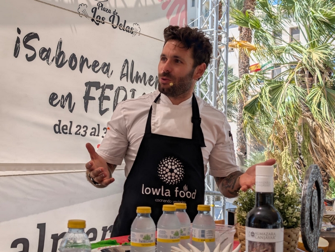 Por su parte, el chef Bosco Benítez, presentador del programa “Tierra de Sabores” de Canal Sur y responsable de la cocina de La Cochera del Abuelo en Sevilla, ha deleitado a los asistentes con dos elaboraciones que sorprendieron por su creatividad y raíz andaluza: un Ajo Blanco de melón con almendras de Gérgal, piñones, mojama de atún de Salazones Asencio y AOVE de la Almazara de Canjáyar, y un Rol de cabrito, cocinado a baja temperatura, desmigado de Cabrito de Los Filabres con baba ganoush de berenjena asiática y de Coprohníjar, acompañado de una salsa tipo soja. Ambas propuestas pudieron ser degustadas por el público, que premió con aplausos la combinación de producto local y técnica culinaria innovadora.