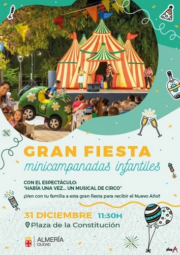 La Plaza Vieja de la capital acogerá mañana miércoles, 31 de diciembre, a las 12:00 horas, las Mini Campanadas Infantiles, un evento dirigido a los más pequeños – preferentemente menores de 14 años – y a sus familias, que se incorpora por primera vez a la programación navideña diseñada por el Ayuntamiento de Almería, a través del Área de Urbanismo, Vivienda y Fiestas Mayores.
