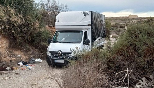 Una vez en el lugar, se observa un vehículo matrícula de Polonia que se encontraba abierto y con las llaves puestas, así como todo revuelto en su interior. Dicho vehículo se encontraba cargado con diverso material, tras proceder a la inspección del mismo, se localiza en su interior en un primer momento 3 bolsas transparentes envasadas al vacío cuyo contenido parece ser marihuana, con algo más de un kilogramo de peso cada una, así como utensilios que supuestamente podrían usarse para el cultivo de la sustancia. En la parte trasera del vehículo se observa como han estado manipulando la mercancía, las barras de protección se encontraban sueltas y algunas en el suelo. La lona se encontraba abierta y levantada por el lado izquierdo del vehículo y el mando del hidráulico de la puerta trasera conectado con la intención de descargar.