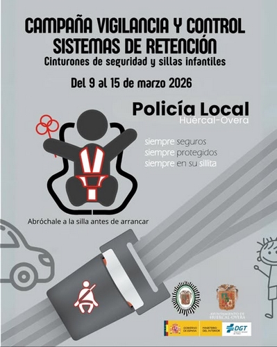 El Ayuntamiento de Huércal-Overa, a través de la Concejalía de Seguridad Ciudadana, informa que la Policía Local llevará a cabo una campaña especial de vigilancia y control desde hoy, día 9, hasta el próximo domingo 15 de marzo. Esta actuación se centrará específicamente en el uso del cinturón de seguridad y de los sistemas de retención infantil (SRI).