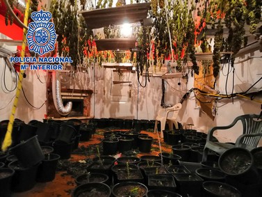 Durante el primer registro practicado, los agentes de la Policía Nacional incautaron 346 plantas de marihuana, una bolsa con un kilo de cogollos de marihuana, 33 transformadores, 32 lámparas halógenas, 50 bombillas de 600w, dos extractores, y cuatro ventiladores.