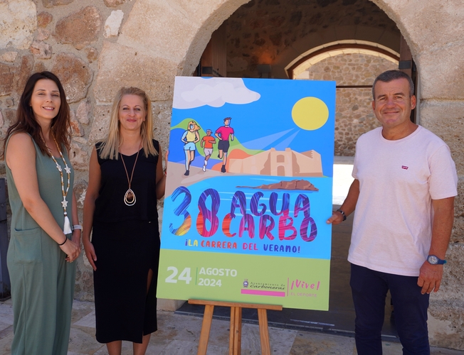 .- El alcalde de Carboneras, Salvador Hernández, y las concejalas de Eventos Deportivos y de Deportes, Isabel Hernández y Mariana Esteban, han presentado la 38º edición de la popular carrera Aguacarbo, que se celebrará el próximo sábado 24 de agosto para volver a coronarse como la carrera del verano. Las inscripciones ya están abiertas en www.cruzandolameta.es para poder recorrer los 10 kilómetros de distancia que separan Aguamarga y Carboneras, con espectaculares paisajes dentro del parque natural Cabo de Gata-Níjar y con meta en el Castillo de San Andrés.