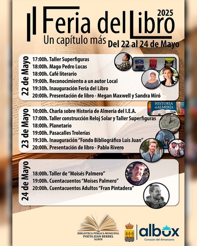 Café Literario, charlas sobre historia, Pasacalles Trolerías y así una larga lista citas que prometen superar las cifras de la primera edición. “En Albox apostamos por la cultura. Lo dijimos desde el principio y esta segunda edición de la Feria del Libro es un claro ejemplo de lo que queremos para nuestro pueblo. Hemos hecho un gran esfuerzo para traer autores de talla nacional, se han programado muchas actividades para nuestros niños y jóvenes, y el apoyo a las librerías locales que espero que durante estos tres días vendan muchos libros” asegura la alcaldesa de Albox, María del Mar Alfonso.
