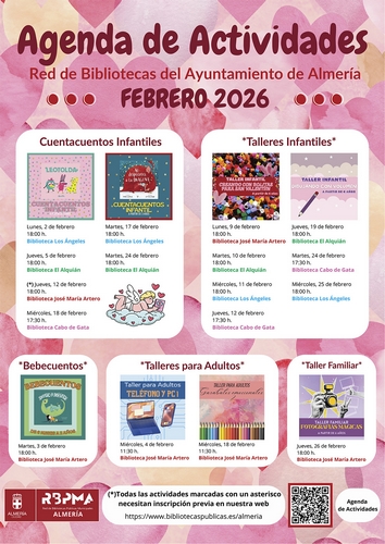 Habrá dos cuentacuentos: ‘Leotolda’ -que estará en Los Ángeles, El Alquián, Central y Cabo de Gata los días 2, 5, 12 y 18 de febrero, todos a las 18.00 horas, excepto en Cabo de Gata, siempre a las 17.30 horas); y ‘No Despiertes a la Dragona’ -17 y 24 en Los Ángeles y El Alquián-, y un Bebecuentos, el día 3, titulado ‘Adoptar Un Dinosaurio’, en la Central José María Artero.