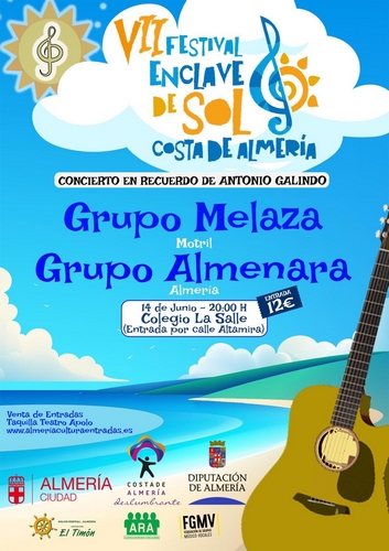 El patio del Colegio de La Salle (entrada por calle Altamira) reciba el próximo sábado, 14 de junio, la séptima edición del festival ‘Enclave de sol, Costa de Almería’. Un evento liderado por el almeriense Grupo Almenara, que cuenta además con la colaboración tanto del Área de Cultura, Tradiciones y Fiestas Mayores del Ayuntamiento de Almería, como del Área de Cultura, Cine e Identidad Almeriense de Diputación Provincial. La cita comenzará a las 20.00 horas y contará con las actuaciones del grupo Melaza, de Motril, y de los propios Almenara, en condición de agrupación anfitriona. Se rendirá un homenaje a Antonio Galindo, que fue miembro del Grupo Almenara