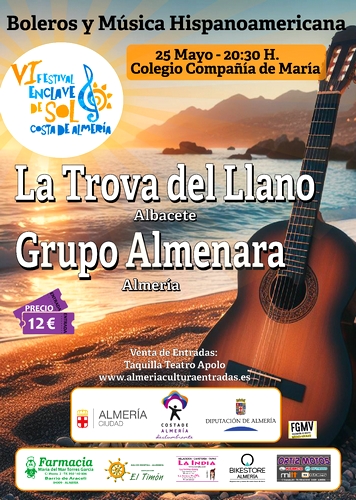 El patio exterior del colegio de la Compañía de María reciba el próximo sábado, 25 de mayo, la sexta edición del festival ‘Enclave de sol, Costa de Almería’. Un evento liderado por el almeriense Grupo Almenara, que cuenta además con la colaboración tanto del Área de Cultura, Tradiciones y Fiestas Mayores del Ayuntamiento de Almería, como del Área de Cultura, Cine e Identidad Almeriense de Diputación Provincial. La cita comenzará a las 20.30 horas y contará con las actuaciones del grupo albaceteño La Trova del Llano y de los propios Almenara, en condición de agrupación anfitriona.