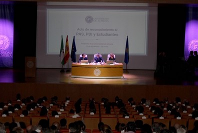 Por primera vez la UAL, en particular el rector Carmelo Rodríguez, ha querido “aunar en un único encuentro, a todo el capital humano de la Universidad de Almería, profesorado, personal de administración y servicios y estudiantes” para rendirle homenaje. En un mismo evento la en la tarde del miércoles, 11 de diciembre, ha celebrado el reconocimiento de los 25 años de servicio del Personal de Administración y Servicios y del Personal Docente e Investigador, los premios al profesorado que ha destacado en su labor docente (Docentia), y los premios extraordinarios de grado, máster y doctorado de nuestros estudiantes.