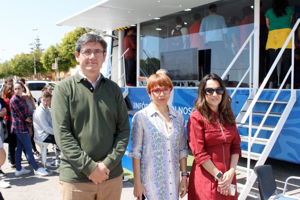 El alcalde, Manuel Cortés, ha visitado el autobús itinerante junto a la vicerrectora de Extensión Universitaria de la UAL, María del Mar Ruíz y la comisaria del 25 aniversario de la UAL, Elisa Álvarez. El primer edil ha agradecido a la Universidad de Almería su presencia en Adra porque “es importante que los estudiantes de nuestra ciudad conozcan de primera mano las posibilidades que brinda la Universidad de Almería” y para “ayudarles a orientar su futuro académico”.