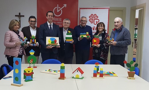 Cáritas Diocesana de Almería ha recibido este miércoles varios lotes de juguetes fabricados por las personas usuarias de la Unidad de Estancia Diurna con Terapia Ocupacional Javier Peña. Esta donación, una tradición navideña del centro Javier Peña, permitirá que los juguetes de madera confeccionados en el centro lleguen a menores en situación de riesgo social o especial vunerabilidad.