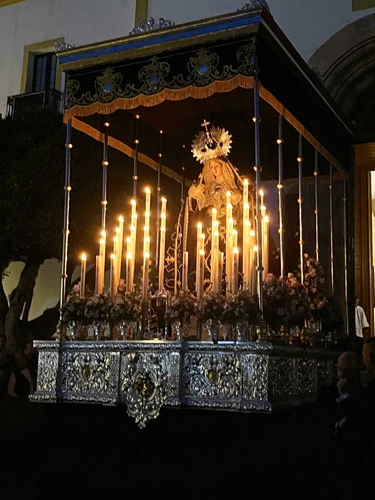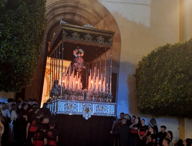 Pero sin duda, uno de los momentos más emocionantes de la noche fue la salida del paso de la Virgen de la Soledad. El nuevo palio descendió con solemnidad los ocho escalones de la escalinata del templo, recibiendo el aplauso respetuoso de los fieles que se congregaron en la Plaza Cristo de la Luz. La plaza, iluminada con toda la candelería encendida del paso y perfumada por un simbólico exorno floral, se convirtió en un escenario de recogimiento y belleza, al que la Agrupación Musical San Luis de Albondón ponía la banda sonora.