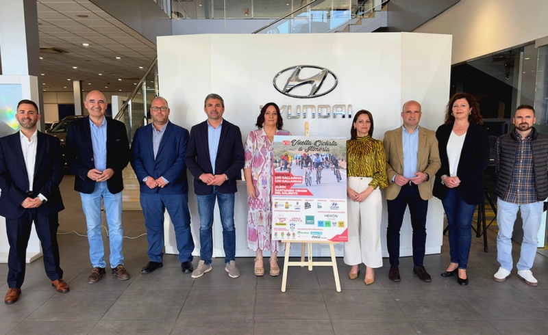 El vicepresidente de la Diputación Provincial de Almería, José Antonio García, y los alcaldes de Los Gallardos y Albox, Francisco Reyes y María del Mar Alfonso, respectivamente, acompañados por el CEO de Total Sport Mediterranean, Sergio Domínguez, han presentado este miércoles la octava edición de la Vuelta Ciclista a Almería en las instalaciones de Hyundai Almerialva en Huércal de Almería, con su responsable, María José Fernández, como anfitriona.