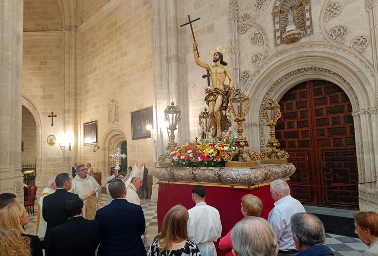 En uno de los laterales por la puerta de entrada al claustro, en el paso del Corpus Christi, la imagen sagrada de Nuestro Padre Jesús Resucitado, cotitular de la Agrupación de Cofradías, adornado con un bello exorno floral y flanqueado por cuatro candelabros antiguos del trono del Cristo de la Escucha y un relicario con la reliquia de San Indalecio, Patrón de la diócesis almeriense.
