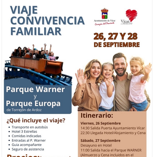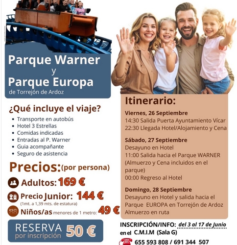 El Ayuntamiento de Vícar, a través del Área de Familias, organiza un nuevo viaje de convivencia con destino al Parque Warner y Parque Europa en Madrid. Los días 26, 27 y 28 de septiembre tendrá lugar esta escapada donde se propone a las familias del municipio disfrutar de unas de las principales atracciones de la capital, todo ello en un ambiente de convivencia y entretenimiento.