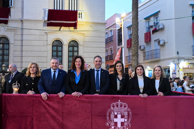 Desde la tribuna de la Plaza de la Catedral, y acompañada por los concejales Diego Cruz, Juan José Segura, María del Mar García Lorca, Lorena Nieto, Paola Laynez y Amalia Martín, ha seguido la jornada de este Lunes Santo la alcaldesa de Almería, María del Mar Vázquez.