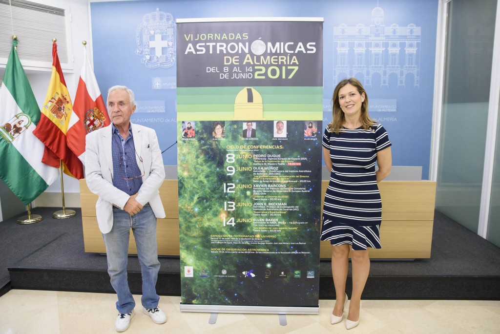 Jornadas Astronómicas vuelven a Almería y lo hacen, como ocurrió en sus primeras cinco ediciones, celebradas de 2005 a 2009, con un cartel de auténtico lujo, tal y como han presentado hoy la concejala del Área de Cultura, Educación y Tradiciones del Ayuntamiento de Almería y el coordinador de la actividad, Pedro San José. Concretamente se desarrollarán del jueves 8 al miércoles 14 de junio, con un ciclo de cinco conferencias, una exposición de fotografía y una noche de observación astronómica. Todas las actividades son de carácter gratuito hasta completar el aforo.