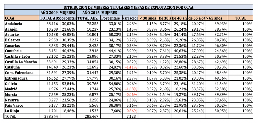 El avance del estudio estratégico, que COAG y CERES están ultimando para impulsar el empleo femenino en el medio rural, recoge que tan sólo 4 Comunidades Autónomas han reducido el porcentaje de mujeres titulares o jefas de explotación: Madrid, Cataluña, La Rioja y Murcia. El resto de Comunidades Autónomas han aumentado el protagonismo de las mujeres en este segmento. Son destacables los incrementos en País Vasco (5,16%) Cantabria (3,99%) Baleares (3,77%) y Andalucía (2,98%). Ver tabla completa en pág 2.