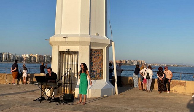 Este pasado miércoles, otras cien personas de todas las edades disfrutaron un miércoles más de las sensaciones de ver ponerse el sol por poniente, mientras un ferri entraba por la bocana del Puerto a la sombra del Faro, y Pablo Mazuecos y Ana Bravo interpretaban temas de soul, jazz y funky. La dulce voz de Ana Bravo, acompañada al piano por Pablo, llenaron de magia este espacio portuario, creando una atmósfera especial.