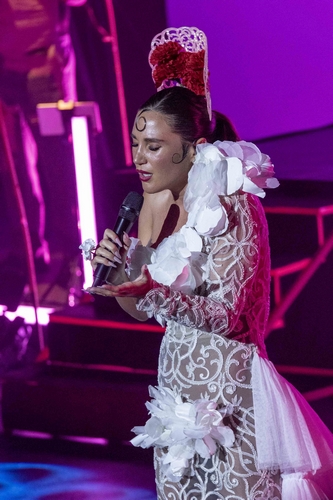 El inicio fue arrollador. Laura Gallego apareció con un imponente traje blanco de bata de cola, interpretando copla con una fuerza escénica que sorprendió al público, en una apertura de gran potencia que fue creciendo hasta transformarse visualmente en un vestuario moderno y brillante, marcando el tono innovador de toda la noche.