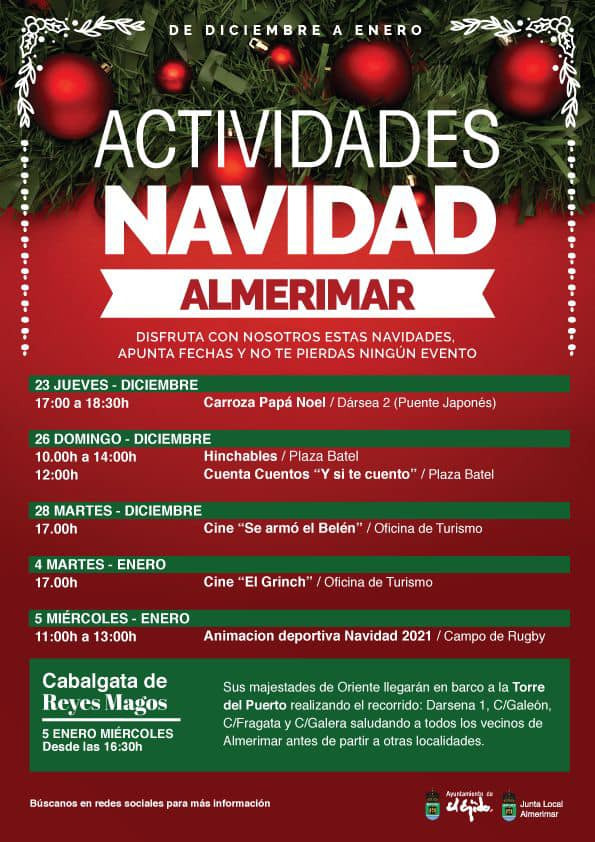 El Ayuntamiento ha querido este año reforzar el calendario de propuestas en todos los núcleos de población para que todas las familias y, en especial los más pequeños, puedan ser partícipes de la animación y diversión propias de estas fechas. En el caso de Almerimar, el 23 de diciembre, de cinco a seis y media de la tarde, está prevista la llegada de la Carroza de Papá Noel a la dársena 2. El domingo, 26 de diciembre, de diez de la mañana a dos de la tarde, los más pequeños podrán disfrutar de los hinchables gratuitos en la Plaza Batel y a las doce del mediodía, habrá un cuentacuentos, ‘Y si te cuento’. El martes, 28 de diciembre, no faltará el buen cine. En la Oficina Municipal de Turismo se proyectará ‘Se armó el Belén’. El martes, 4 de enero, tendrá lugar la proyección ‘El Grinch’, a las cinco, también en la Oficina Municipal de Turismo. El miércoles, 5 de enero, de once de la mañana a una de la tarde, habrá animación deportiva en el Campo de Rugby.