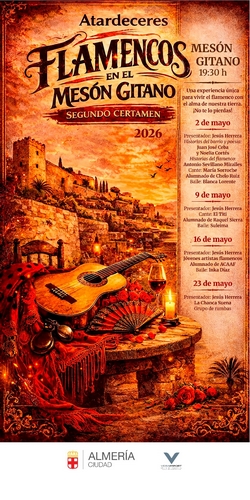 Llega mayo florido y con él, por segundo año, una nueva edición de ‘Atardeceres Flamencos en el Mesón Gitano’. Una propuesta cultural que se celebrará durante los primeros cuatro sábados del mes de mayo, consolidándose como una de las citas destacadas en la programación de primavera de la ciudad puesta en marcha por el Área de Cultura, Educación y Tradiciones del Ayuntamiento de Almería. La primera cita será este sábado, 2 de mayo, a partir de las 19.30 horas y, como es habitual, con entrada libre hasta completar aforo.