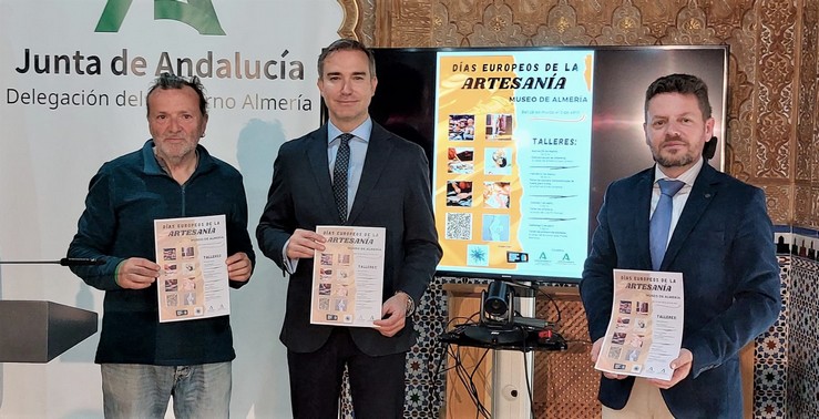 Los delegados de Empleo, Empresa y Trabajo Autónomo, Amós García Hueso, y de Turismo, Cultura y Deporte, José Vélez González, han presentado este martes junto al presidente de la Asociación de Artesanos Profesionales de Almería (APAL), Antonio Flores, la programación de los Días Europeos de la Artesanía 2023, que acercarán al público el saber hacer de artesanos y artesanas almerienses del 27 de marzo al 2 de abril. Se realizará una exposición de obras de artesanos de la provincia y de la Escuela del Mármol de Fines que acogerá el Museo de Almería, donde también se harán demostraciones en vivo y talleres de oficios artesanales. Además, habrá jornadas de puertas abiertas en talleres artesanales de distintos puntos de la provincia.